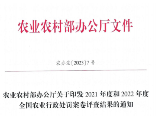 2023-12-25近日,农业农村部办公厅公布了2021年度和2022年度全国农业行政处罚案卷评查结果,由福州市农业综合执法支队承办的生产劣质农药案(榕农(农药)罚〔2021〕3号)、闽清县农业综...