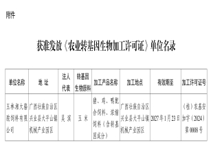 2024-04-11玉林湘大骆驼饲料有限公司于2023年12月21日向我厅申请办理《农业转基因生物加工许可证》。依据《农业转基因生物安全管理条例》和《农业转基因生物加工审批办法》有关规定,我厅对上述企业申请农业转...