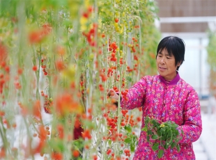 在平山县滹沱河高端设施蔬菜示范区育苗中心,大吾乡田兴村村民安凤翠管护小番茄(11月25日摄)。 近年来,河北省石家庄市平山县把产业振兴作为乡村振兴主攻方向,坚持把增加群众收入作为巩固脱贫成果...