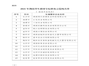 2022-01-06各市州农业农村局: 根据2021年生猪屠宰标准化示范创建工作要求,各地按照质量管理制度化、厂区环境整洁化、设施设备标准化、生产经营规范化、检测检验科学化、清洗消毒常态化、排放处理无害化、肉品...