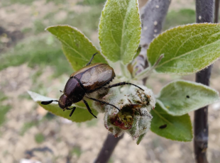 2024-04-11据调查,近期黄陵县部分玉米地金龟子数量很大,呈区域性重发,给临近果园金龟子防治增加了难度,以苹毛丽金龟甲为主。 苹毛丽金龟甲,体卵圆形,长10mm左右。头胸背面紫铜色,并有刻点。鞘翅为茶褐色,具...