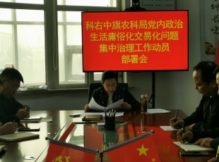 2022-05-07近日,为全面贯彻落实旗委《关于集中治理全旗党内政治生活庸俗化交易问题的工作方案》,农牧和科技局开展党内政治生活庸俗化交易化问题集中治理工作动员部署会。党组书记萨如拉主持会议,党组成员、局属各支...